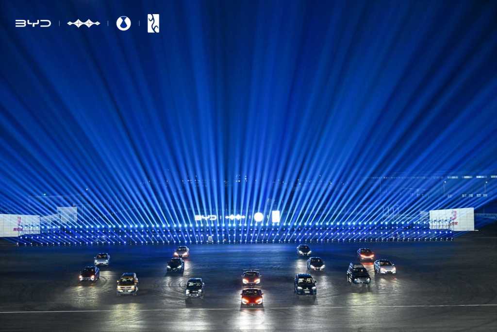 BYD 夜幕下在賽道上透過燈光變化與型號的速度及排列陣營演出令人嘆為觀止